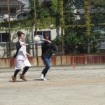 恒例の保護者VS3年生の育友会種目です。2人1組でバレーボールをラケットで挟んでリレーしました。