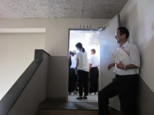 各学年ごとに、校内の備蓄庫を見学、確認し、倉庫にある発電機