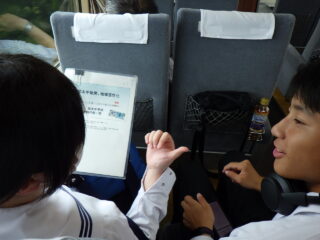 ↓ 会場に向かうために乗った南海サザンの中で、最後の打ち合わせ・練習を行う2人