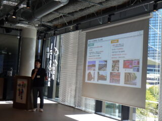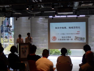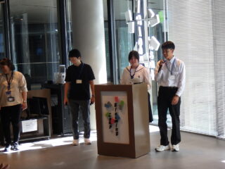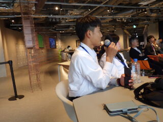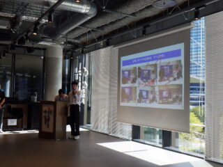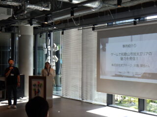 そんな大阪都心の景色を見下ろせるガラス張りの会場で行われたイベントに、本校の生徒会役員2名が参加して、ゲーム制作の取り組みについて発表しました。この会のイベントのテーマは、「地域の未来を担う子どもたちの視点で取り組んだ地域活性化プロジェクトの共有」です。生徒会の2人は、たくさんの大人の視線の中、緊張しながらも、自分たちの言葉で、ゲーム制作について、しっかり伝えることができました。