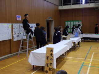 本日、生徒や先生たちはその準備に追われました。まずは会場設営です 椅子を並べたり、展示場所を作りました