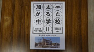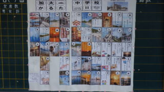 加太カルタ本Ⅱ 完成 投稿日:2025年12月11日2025年12月11日 昨年度より、国語の時間に取り組んでいる加太カルタ 今年度も地域の方が冊子にして生徒たちにプレゼントしてくれました また、この冊子は駅や宿泊施設などにも置いていただけるとのことです 加太中学校の生徒の作品が、たくさんの人の目にとまる機会になればうれしいです。 そしてカルタを一覧表にしたものもいただいたので、学校職員室前廊下に掲示しています