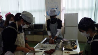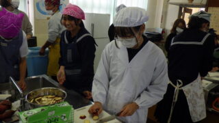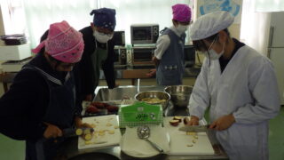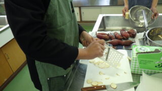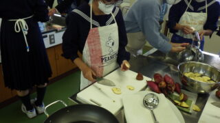 自分たちが育てたサツマイモは、形も大きさも様々。このゴツゴツとした個性豊かなサツマイモを、生徒たちは慣れない包丁で一生懸命カットしていきます。「どう切ろう…」「硬い!」と声を上げながらも、怪我をしないよう慎重に取り組んでいました。