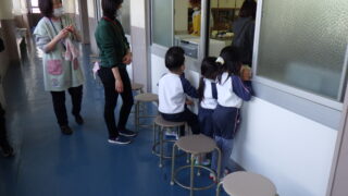 そんな調理の最中、廊下に加太幼稚園の園児さん6人のかわいいゲストが登場。中学生のお兄さんお姉さんが頑張っている様子を、窓越しに応援してくれました。そして、揚げたての素揚げを、園児さんたちが試食してくれました。