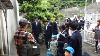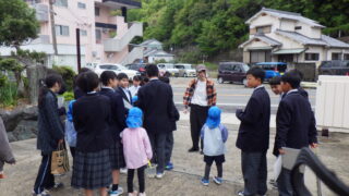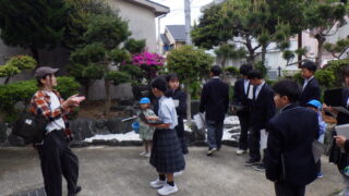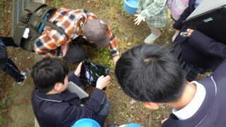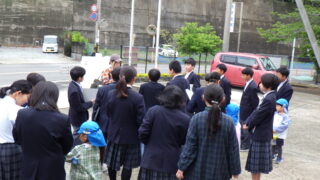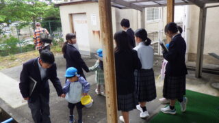 中1 理科 校内自然観察に幼稚園児が参加しました 投稿日:2026年4月24日2026年4月24日 加太幼稚園から5人の園児たちが参加し、中学1年生と一緒に校内の自然観察をしました。 中学生はそれぞれ役割があり、「見つけた虫や植物をタブレットで撮影する係」、「観察した内容をメモに取る係」、そして「園児たちの手をつなぎ安全確保する係」と担当分けしていました。幼稚園児も虫かごや網を手に、中学生と一緒になって一生懸命に生き物を探していました。 理科の学びを深めるとともに、中学生と幼稚園児の心温まる交流のひとときとなりました。