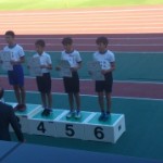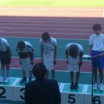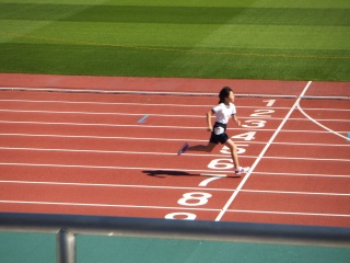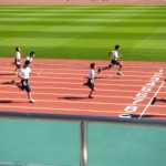男女4×100リレー予選の様子 座って待っている後姿に緊張感が感じられます