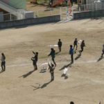 6年生にも手伝ってもらって、運動場で凧揚げをしました。一人一人が好きな模様を描いて作った凧が、強い風にのり、空高くまであがりました。