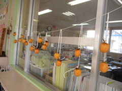 今年も園庭の渋柿がたくさんでき、子供達と収穫をしました。年長さんを中心に、ピーラーで柿の皮をむいてもらい、消毒のため熱湯に柿を浸しました。そして、残しておいた枝の部分にヒモでくくり、玄関のところにつるしました。