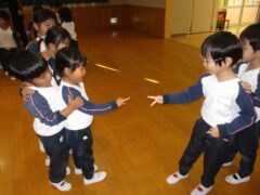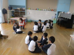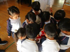 どんぐりころちゃんは、地域の方に来ていただいている「語りのもり」さんが教えてくれたみんなが大好きな手遊びです。ドングリをどちらかの手に隠して「どーっちだ?」と歌に合わせて聞きます。