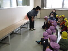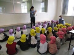 いつも給食を作ってくださっている、第一調理場にみんなで出かけました。調理場は子供の足で歩いて15分くらいの距離にあります。3歳児もしっかり歩いてみんなワクワクしながら出発しました。