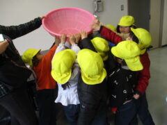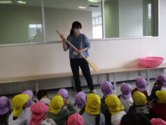 大きなお鍋に「わぁ!大きい。」と目を丸くして驚いていました。また、実際に大きなしゃもじやザルを見せていただき、触らせてもらいました。