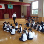 新学期が始まり、4歳児 ばら組さん、5歳児 ふじ組さんは、少し緊張した様子で遊戯室に集まりました。