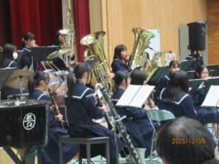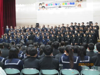 12月5日(金)、令和7年度文化祭を開催しました。11月19日を予定していましたが、インフルエンザがひろがっていたため、急遽延期しました。感染拡大を防ぐため、歌の練習を中止せざるを得ない日も続き、しっかり歌えるのだろうか、と不安を残しての開催となりました。しかし、合唱コンクール本番が始まると、そんな不安はどこへやら、一年生の大きく元気いっぱいの歌声に続き、各クラスの予想をはるかに超える素晴らしい歌声が体育館いっぱいに広がっていました。すべての聴衆が、それぞれのクラスのパフォーマンスに引き込まれていました。3年生は学年全体合唱も披露してくれましたが、ハーモニー・迫力・歌う姿勢などすべてにおいてさすが3年生!と思わせる合唱でした。午後は、合唱コンクール表彰、吹奏楽コンサート、前生徒会の活動をまとめた動画発表がありました。吹奏楽部による演奏は、会場全体を楽しい音楽の渦に巻き込んでくれました。生徒会の動画は、これまでの活動内容が、真面目かつユーモラスに演出され、会場から所々で笑いが起こっていました。展示の部では、学年・教科・部活動で制作した多種多様な個性あふれる作品が披露され、大変見ごたえがあるものでした。今年も無事文化祭を終えることができたことに感謝いたします。ありがとうございました。