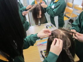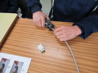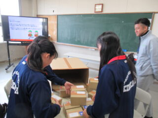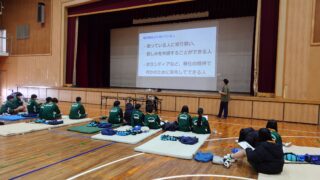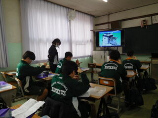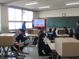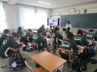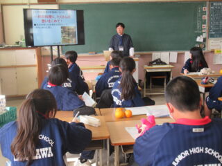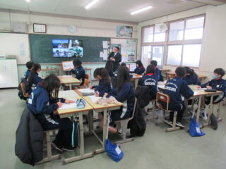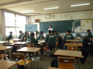 2月10日(火)、1・2年生の生徒を対象に未来スクールの授業を行いました。「未来スクール」は多様な職種で働く地域の大人の方々が「職業先生」になり、その想いや仕事にまつわるエピソードを子どもたちに講話と職業体験で楽しく伝えてくれるプログラムです。今回は初めて1,2年生合同での開催となりました。授業はすべて中学校の総合的な学習の時間の授業の一環として、事前・事後学習も含めた体系的なキャリア学習として取り組んでいます。地元で仕事をすることの可能性や価値についても伝えていただき、日頃は家族や教師以外とはあまり関わる機会の少ない中学生が、直接地域の大人の皆さんと交流できるまたとない機会になっています。