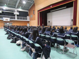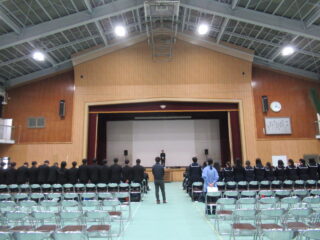 2月10日(火)、1・2年生の生徒を対象に未来スクールの授業を行いました。「未来スクール」は多様な職種で働く地域の大人の方々が「職業先生」になり、その想いや仕事にまつわるエピソードを子どもたちに講話と職業体験で楽しく伝えてくれるプログラムです。今回は初めて1,2年生合同での開催となりました。授業はすべて中学校の総合的な学習の時間の授業の一環として、事前・事後学習も含めた体系的なキャリア学習として取り組んでいます。地元で仕事をすることの可能性や価値についても伝えていただき、日頃は家族や教師以外とはあまり関わる機会の少ない中学生が、直接地域の大人の皆さんと交流できるまたとない機会になっています。