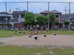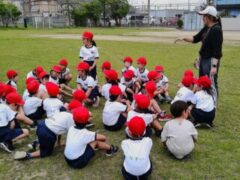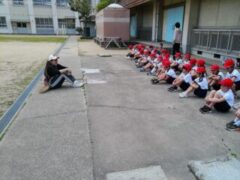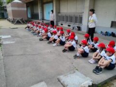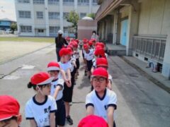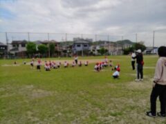 体育の授業です。体操服の着替え方・片づけ方を習いました。外では、整列の仕方を学びました。