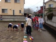 本校と雄湊小学校の5年生の田植えのあと、1年生は、植えていない田んぼに入らせてもらって「どろんこ体験」をしました。保育園で経験した子も数人いたようですが、大半は初体験。はじめこそ恐る恐るだったのが、すっかり慣れるとわざと尻もちついたり、走ってみたり、腕をつっこんで感触を確かめたりする子も出てきました。