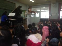 文化庁のアウトリーチ事業の一つに「プロのバイオリニストによるバイオリン演奏」があり、学校として応募していました。音楽室に入った3年生2クラスとフラワー学級のみんなには校長先生から演奏者を紹介してもらいました。実はその演奏者の北島佳奈さんは、校長先生の教え子だったのです。子どもの時の写真やエピソードを交えながら紹介してもらいました。ずっと夢を追ってそれを叶えた北島さんの姿に演奏と共にうっとりしていました。