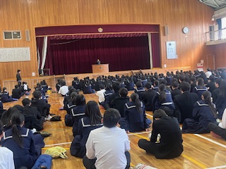 <3学期終業式> 投稿日:2026年4月3日2026年4月3日 ◎令和7年度3学期終業式(3月24日)を行いました。 生徒会長より終業式の挨拶があり、今年度の振り替えりと次年度に向けてのお話がありました。 3学期終業式 生徒会長挨拶