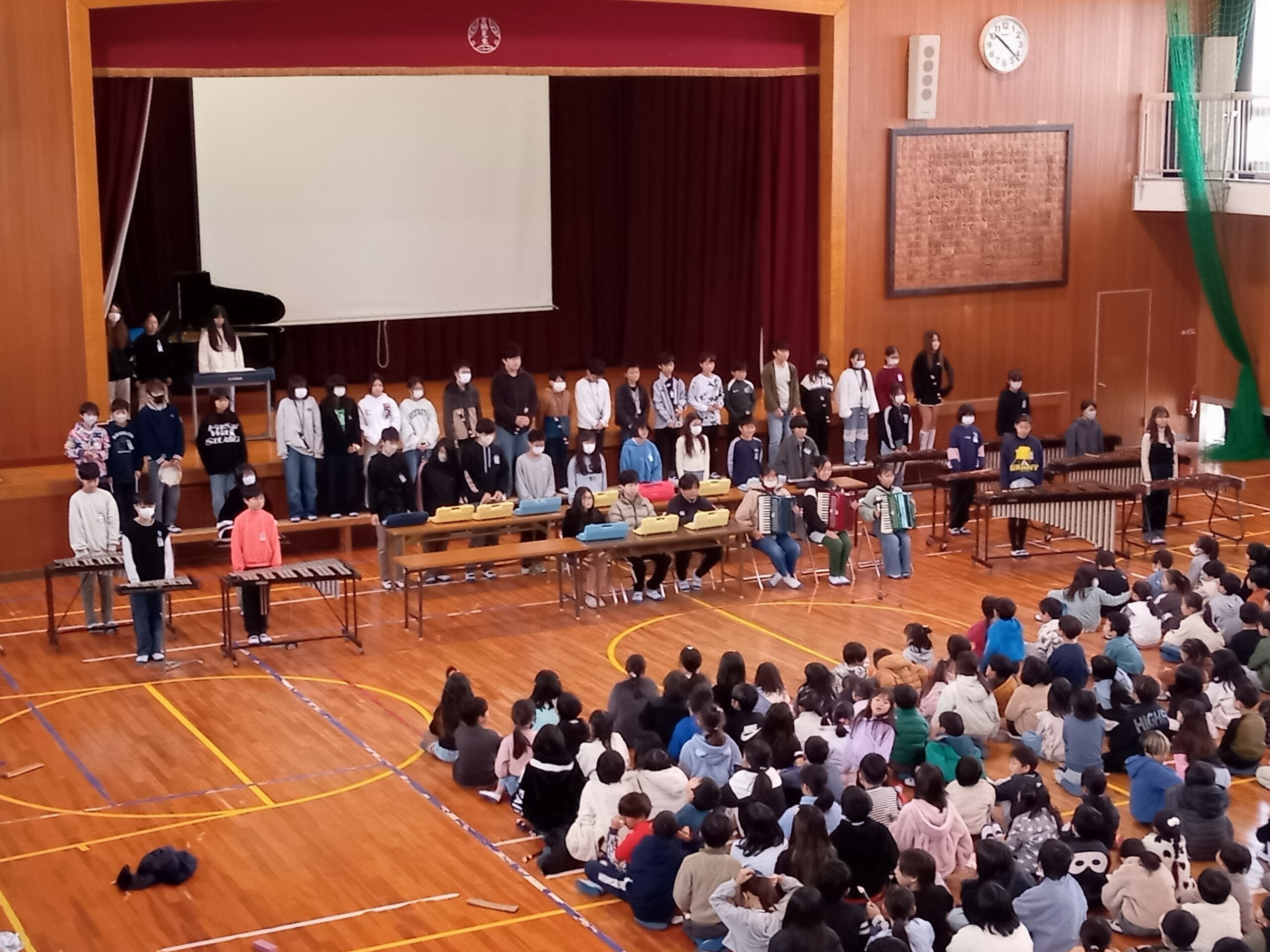あ12月12日(金)に、全校児童が体育館に集まって学習発表会を行いました。1年生は「おとうとねずみチロ」の音読と紙芝居、2年生は「ねこのピート」の音読、3年生は「モチモチの木」の音読劇と合唱・合奏、4年生は「ごんぎつね」の劇と合唱・リコーダー、5年生は「加太合宿」のふりかえり劇、6年生は「怪獣の花歌」の合奏、「大切なもの」の合唱をしました。どの学年も頑張って練習してきた成果を発揮することができていました。