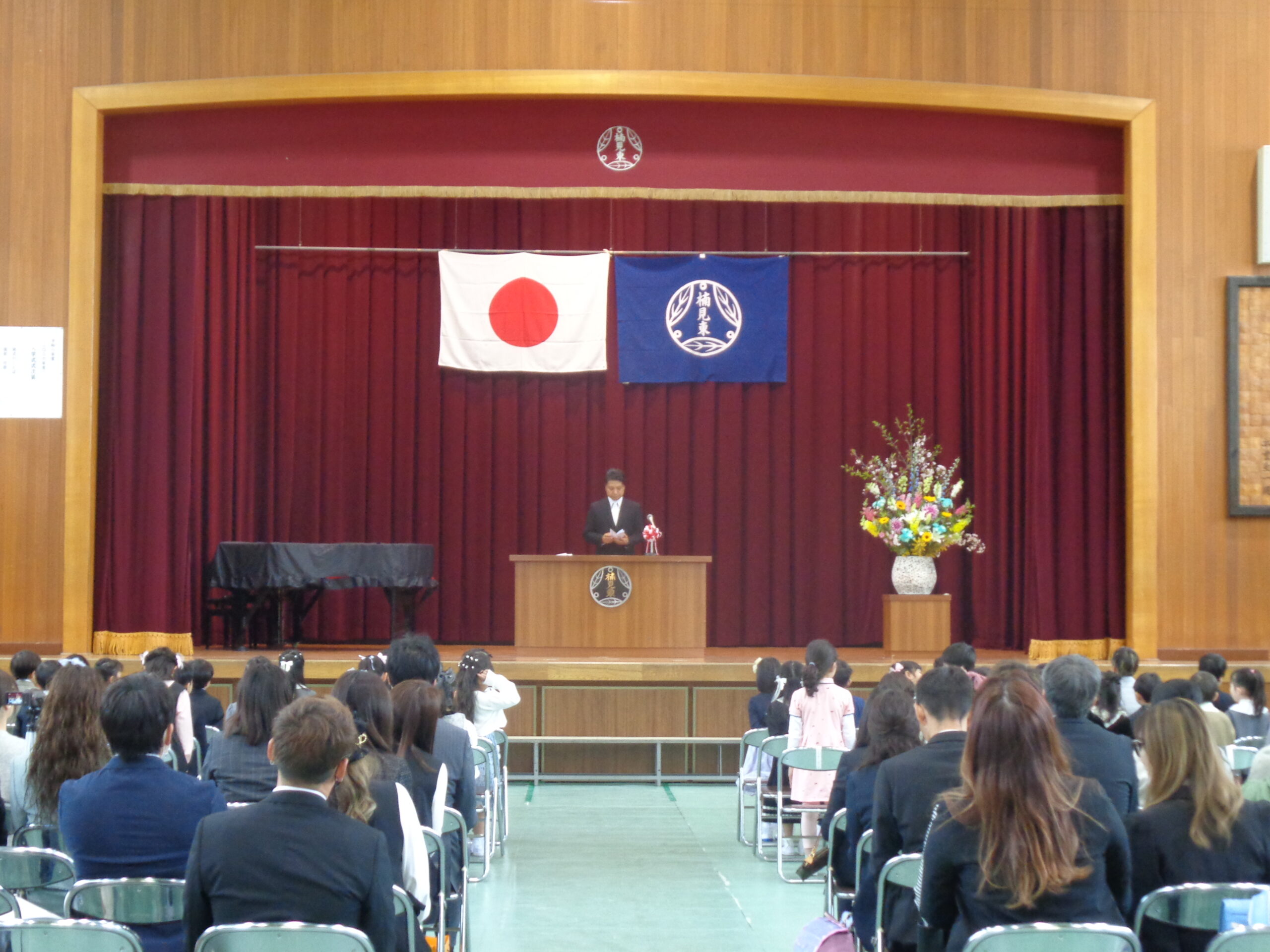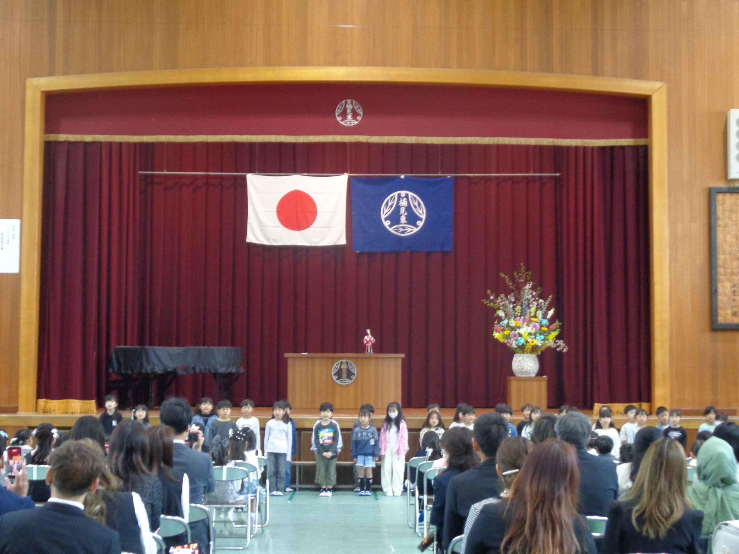 4月9日(木)は入学式を行いました。43名のかわいい1年生が仲間に加わりました。 保護者の方や来賓の皆様に見守られ、ドキドキの入学式です。児童会の代表から「歓迎の言葉」を受け取り、2年生による歓迎の歌「てをつなごうおんぷ」が体育館いっぱいに響く、とても大きくて元気な歌声に1年生もすっかり笑顔に!お兄さん・お姉さんになった2年生の姿が、とても頼もしく感じられた瞬間でした。