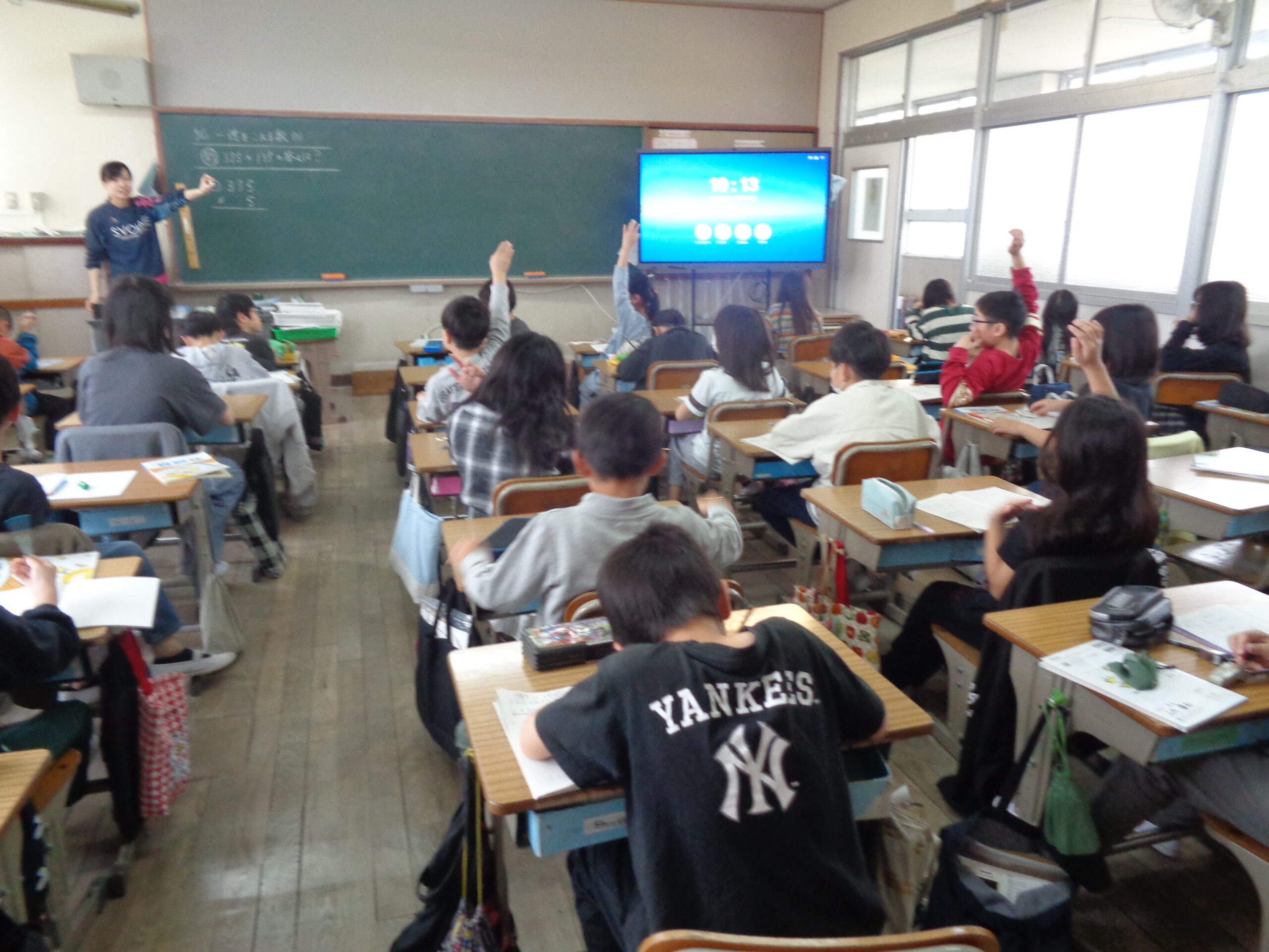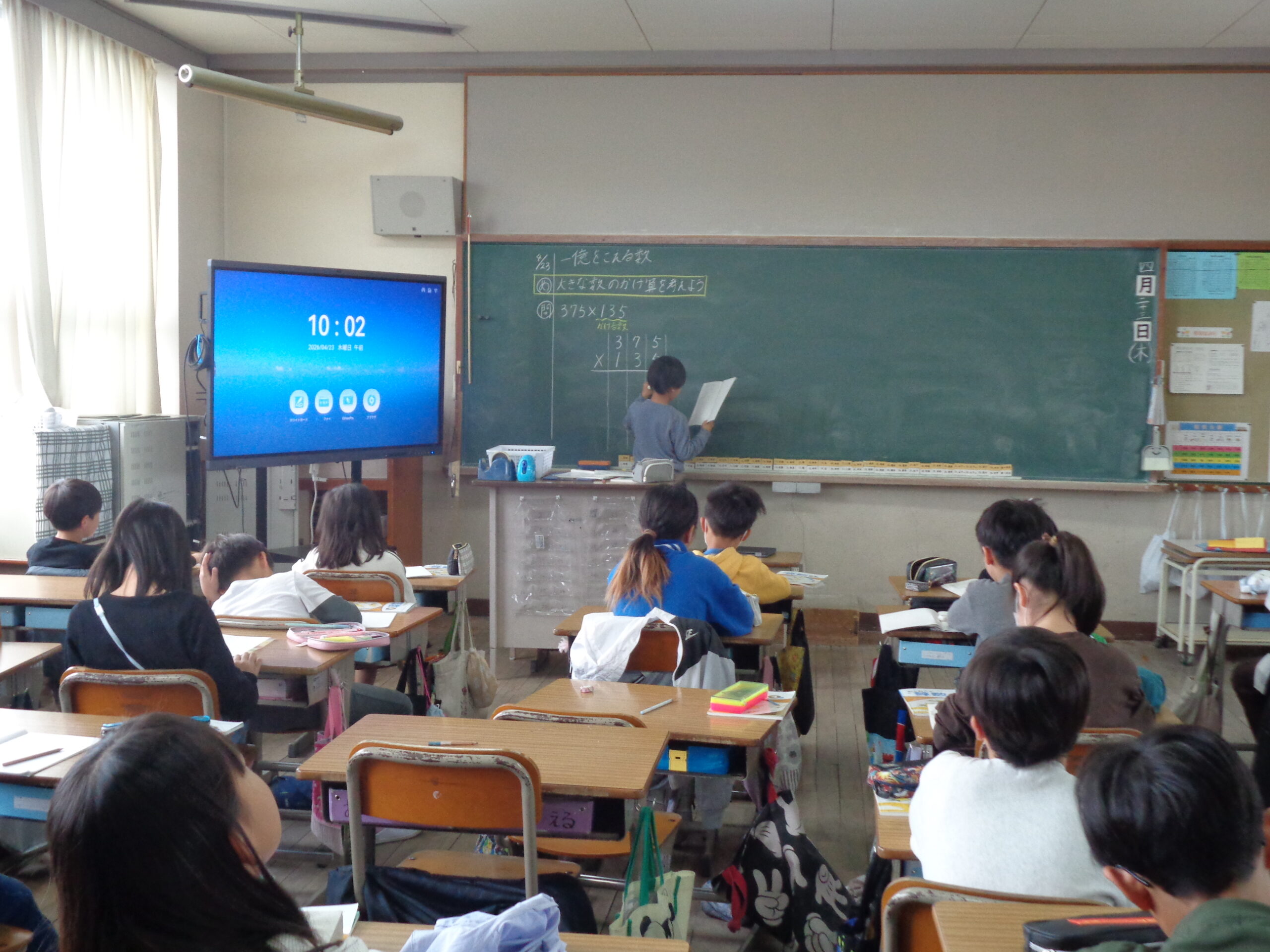 4年生算数の授業の様子から 投稿日:2026年4月23日2026年4月23日 4月23日(木)、4年生の算数の授業では3桁の数かける3桁の数をひっ算で解いていきました。子どもたちは、慣れないひっ算に戸惑いながら、考え方の違いや繰り上がりがどのようになっていくか等を話し合いながら学習していきました。