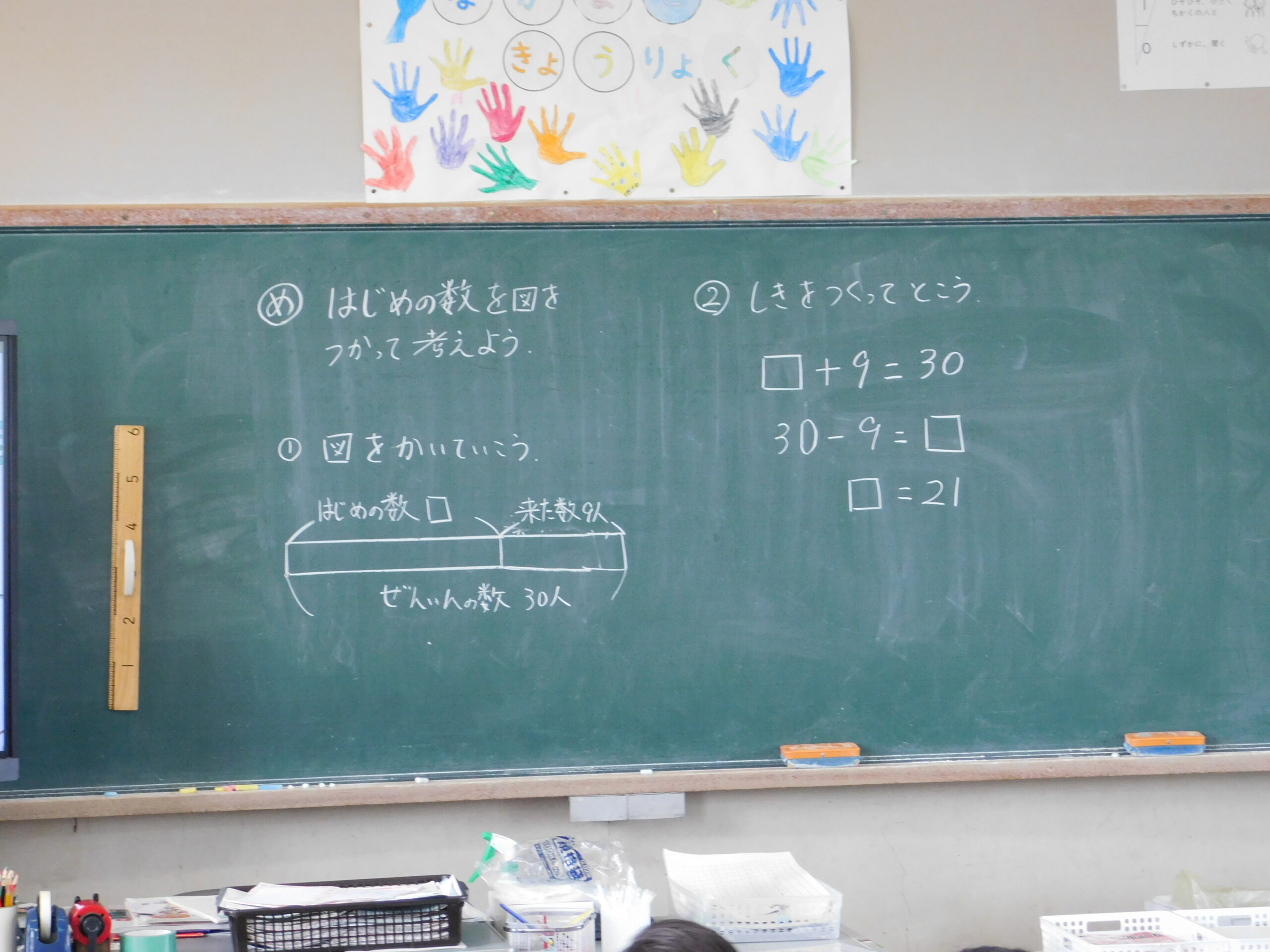 算数で、テープ図を使って考える学習をしました。テープ図を使うのは初めてです。先生に描きかたを教えてもらって、ものさしを使って丁寧に描いていました。図のどこになんの数を書けばよいのか、まだ難しいこともありますが、これからしっかり練習していきます。