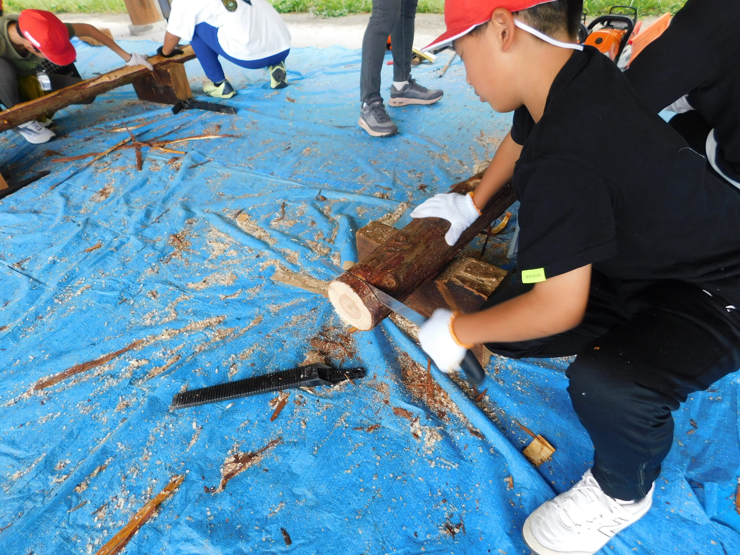 10月3日(木)に、5年生が紀美野町の農村総合センターに行って、林業について学びました。和海紀森林組合の方にお話を聞いたり、木を切ったりしました。この日の天気は雨だったため、山に入って木を切ったり倒したりすることはできませんでした。そこで、和海紀森林組合の方が丸太を用意してくださり、それをのこぎりで切る体験をすることができました。子どもたちは汗びっしょりになりながら、夢中になって切っていました。