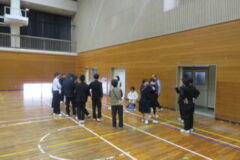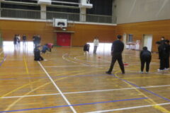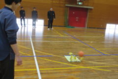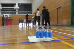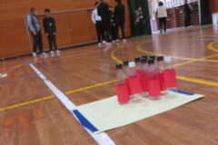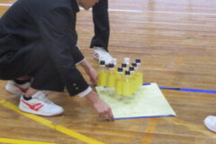 体育館で手作りボーリングのレクリエーションを行いました。先生も一緒に3つのグループに分かれて行いました。