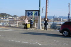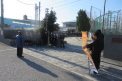 交通ルールやマナーなどを指導していただき、明和中学校からも生徒会が校門で啓発活動を行いました。