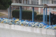 学校の周りで布引大根を並べています。寒さに当てることでおいしさが増すそうです。