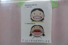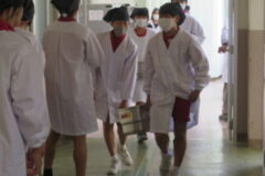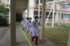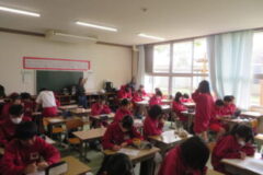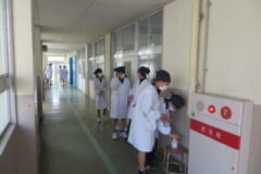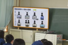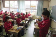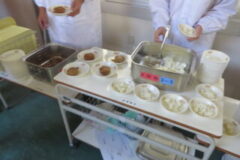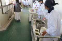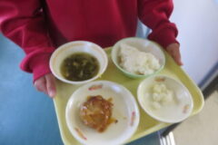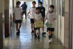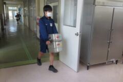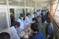 教室で給食学活、流れを説明しました。当番になった人は給食着を着用して三角巾・マスクを着けて、配膳室へ食器と食缶を取りに行きました。混雑をしないように左側通行です。教室前で配膳。みんな揃って「いただきます。」