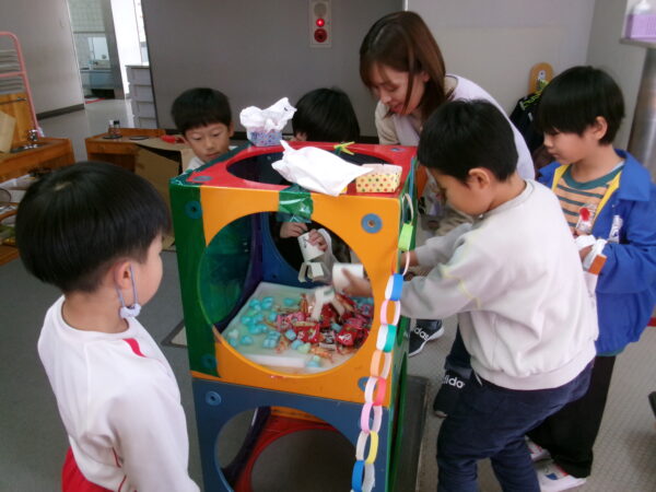 5年生がどんな遊びだと幼稚園の子供たちが楽しめるのか、いろいろと考えてきてくれました。