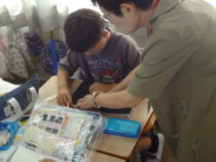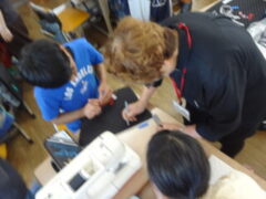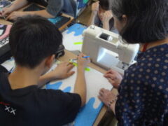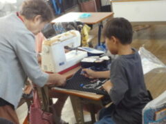 修学旅行に持っていくナップザックのつくり方を教えてもらっています。