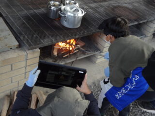 火加減は、みんなで交代で見守って、飯盒炊飯の手順などは、タブレットで記録しました。