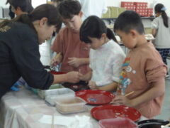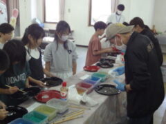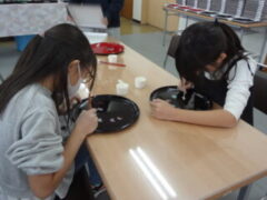 自分が選んだお盆の絵柄に、絵付け体験をしました。