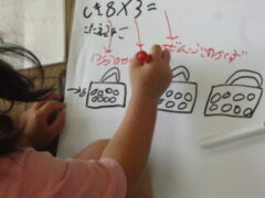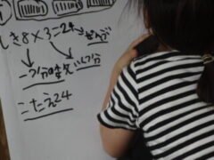 9/25【2年生】かけ算(算数) 投稿日:2025年9月25日2025年9月30日 今日の算数は、 「1ふくろに8こあめがはいっています。 3ふくろではあめは何こになりますか」 について考えました。 一人一つ、ノートとは別に、 「マイホワイトボード」持っています。 これに自分の考えたことを式や図に表して、 発表し合い、考えました。 自由に大きく書けるので、みんな書くことを楽しみにしていて、 のびのびとしっかりかいて頑張っています!