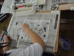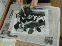 筆でぽたぽた墨をたらしたり、スパッタリング技法で墨をブラシで吹き付けたり、