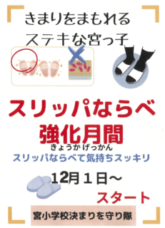 現在、宮小学校では「スリッパならべ強化月間」が開催されています。児童会の発案によるもので、ポスターや放送委員会とのコラボによる放送で、「スリッパをならべよう」と呼びかけてくれています。