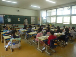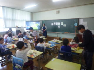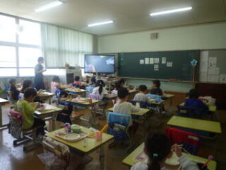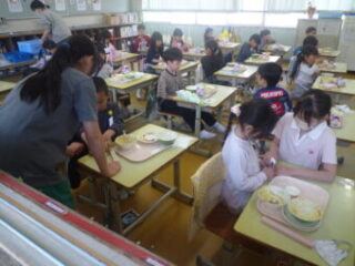 給食の後片づけには、6年生が来てくれて、牛乳パックのたたみかたや食器の片づけ方を教えてくれました。