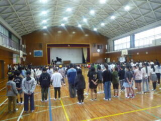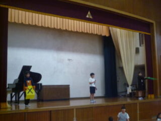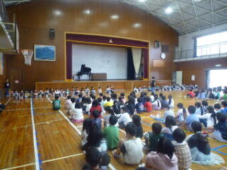 1年生を迎える集会を行いました。児童会さんと代表委員さんが準備や司会をしてくれました。6年生が1年生と手をつないで入場。1年生は6年生にすてきなメダルをもらって、それを首から下げての入場でした。