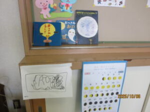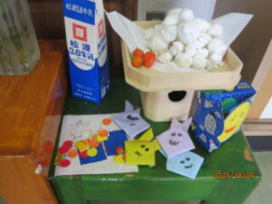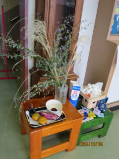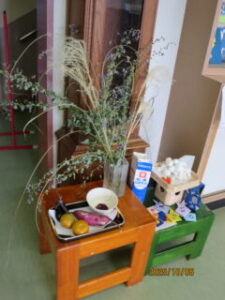 幼稚園では玄関に、ススキやハギをお供えしました。早速子供たちは、「お月見やな・・・」「団子いるな」「牛乳のみたいかな・・・」園庭で収穫してきた柿やサツマイモ、ピーマン、粘土で作ったお団子等をお供えしてくれました。またお月さまの絵本も集まってきました。