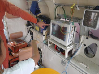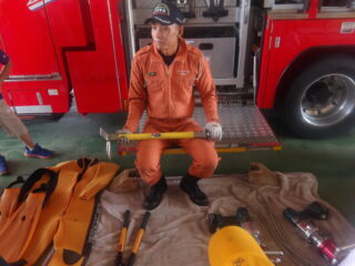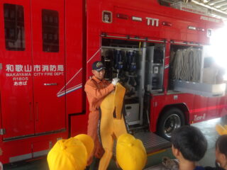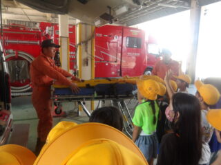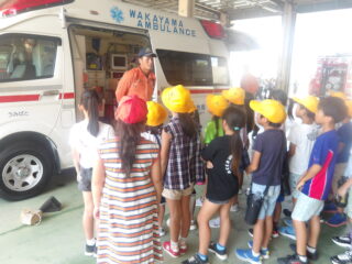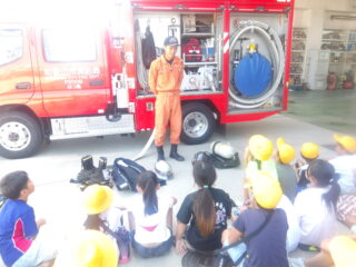 オレンジ色の消防服を着た隊員さんが消防車や救急車のヒミツを教えてくれました。