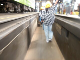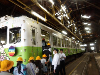 伊太祁曾駅では車庫の中で「動物愛護電車」に入らせてもらって、車掌さんに電車についての質問に答えてもらいました。