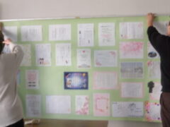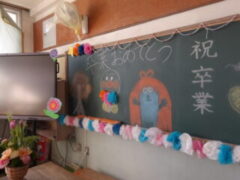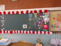 式当日に参列しない1〜4年生は、前日に「お別れ式」を行いました。廊下に並んで花道を作り、拍手と「おめでとう!」の声で6年生を見送りました。手作りの掲示物や温かい言葉で、これまでの感謝をしっかりと伝えることができました。お別れ式が終わった後は、翌日の卒業式のために担当場所を心を込めて掃除しました。