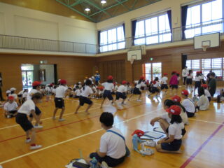訓練のため、事前学習では「いつ」「どこで」地震が起きても安全に早く避難できるように学習しました。休憩中はみんな元気いっぱいで遊んでいましたが、訓練が始まるとしっかり放送を聞いて避難をすることができました。