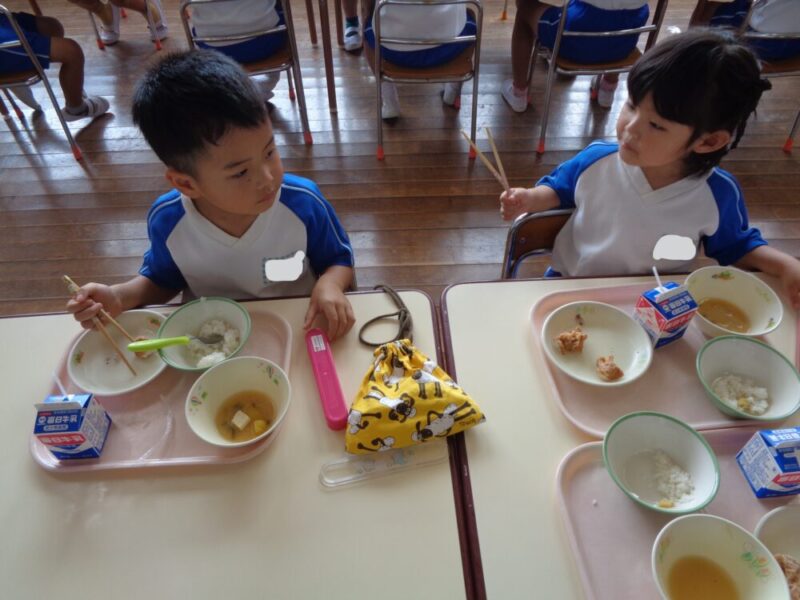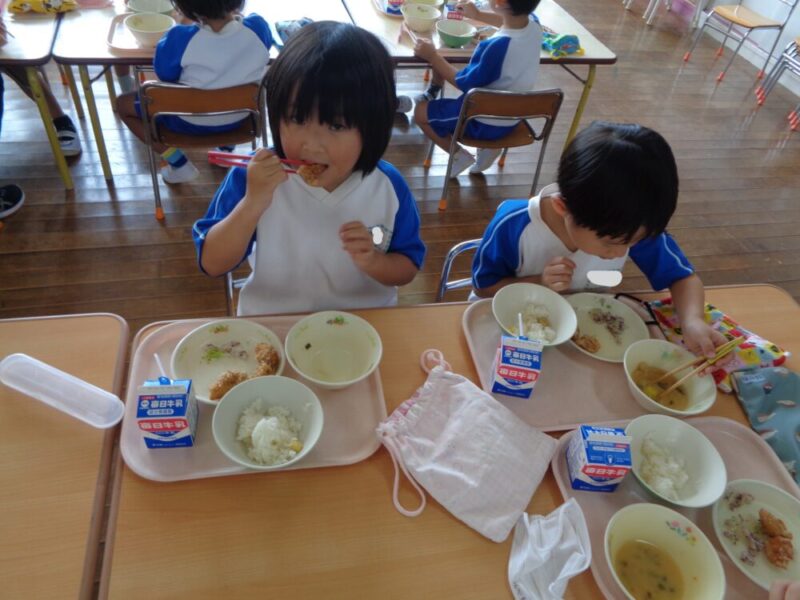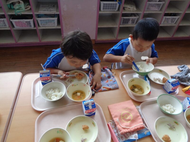 お味噌汁の中にもサツマイモが入っていて、「甘いね」「おいしいね」と、秋の味をたくさん味わえた給食でした。