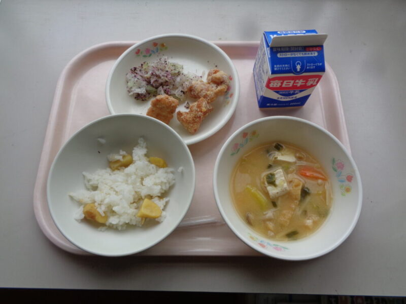 今日の給食は『栗ご飯・鶏肉の唐揚げ・ゆかりあえ・秋野菜の味噌汁』です。秋が感じられる献立です。栗ご飯は、ほくほくした栗を見つけて「栗あった!」「見てみて」と友達と見せ合っていました。栗ご飯は、「もっと食べたい!!」と、大人気でした。