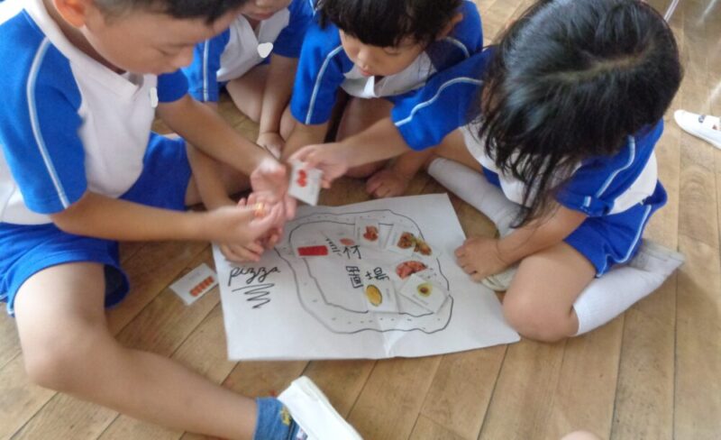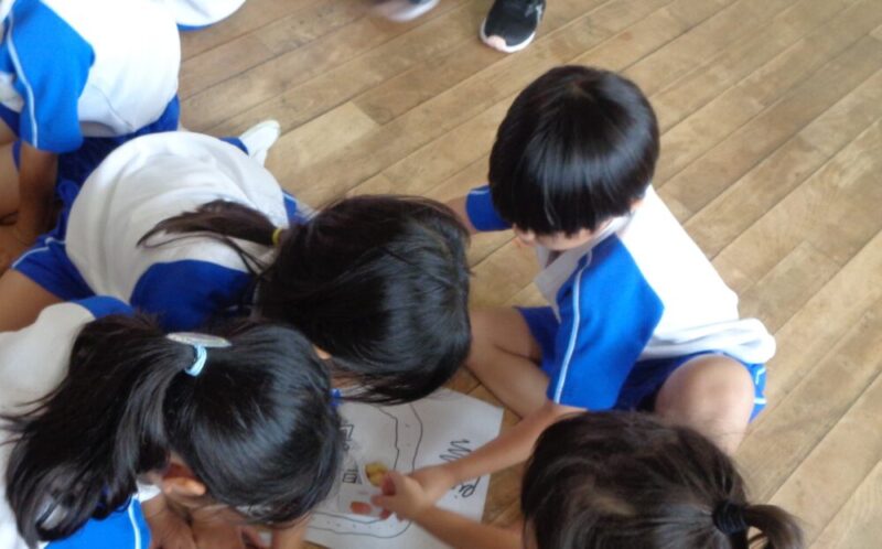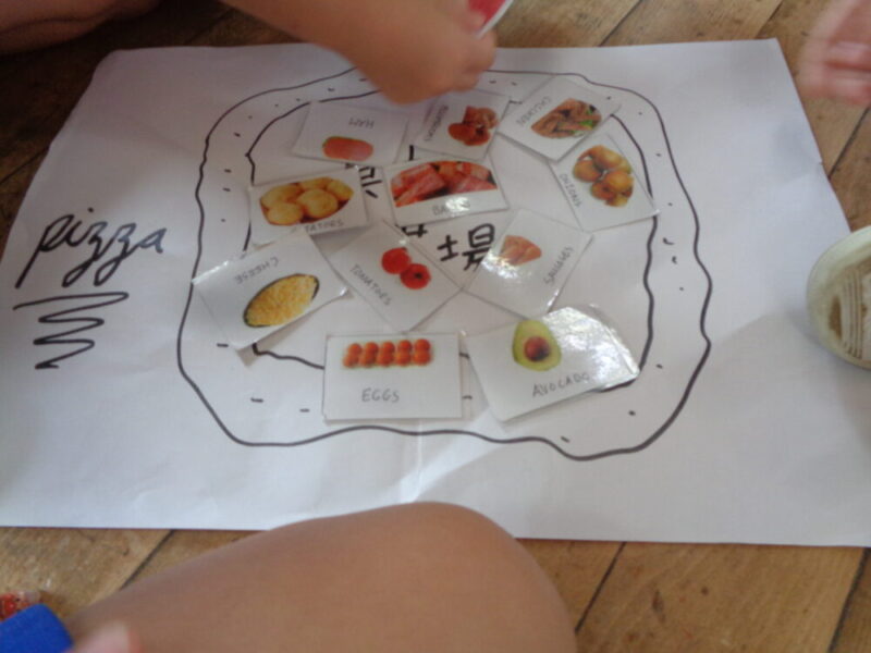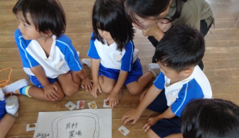 毎月、来てくれるアラン先生のことをみんな楽しみにしています。今日の英語は、ピザにのせるものを英語で教えてくれていました。子供たちもピザにのせる具材なので、馴染みもあり、イメージしやすかったようです。3歳児は「アボカド」の発音が難しかったようですが、それも3歳児が元気に発音をすると、とてもかわいく聞こえます。アラン先生が英語で発音した具材のカードを友達と一緒に考えながら、ピザにトッピングしていくのが楽しかったようでした。遊びの中で、自然に英語の表現にふれることが出来、子供たちの身近な食べ物を通して英語に親しんでいました。