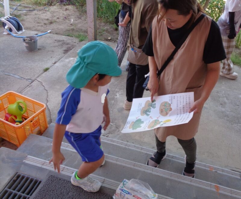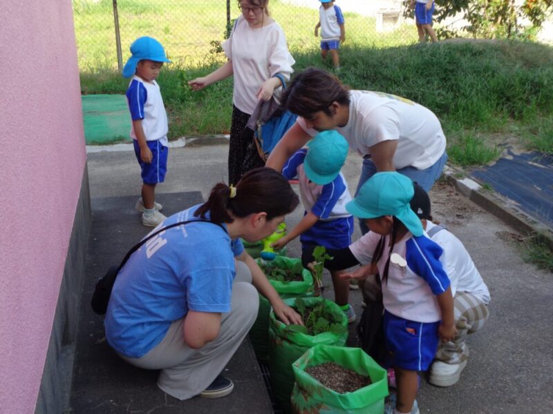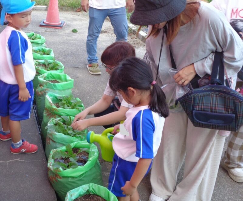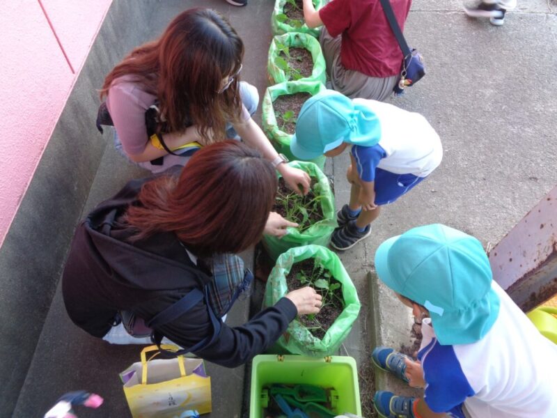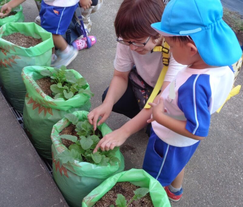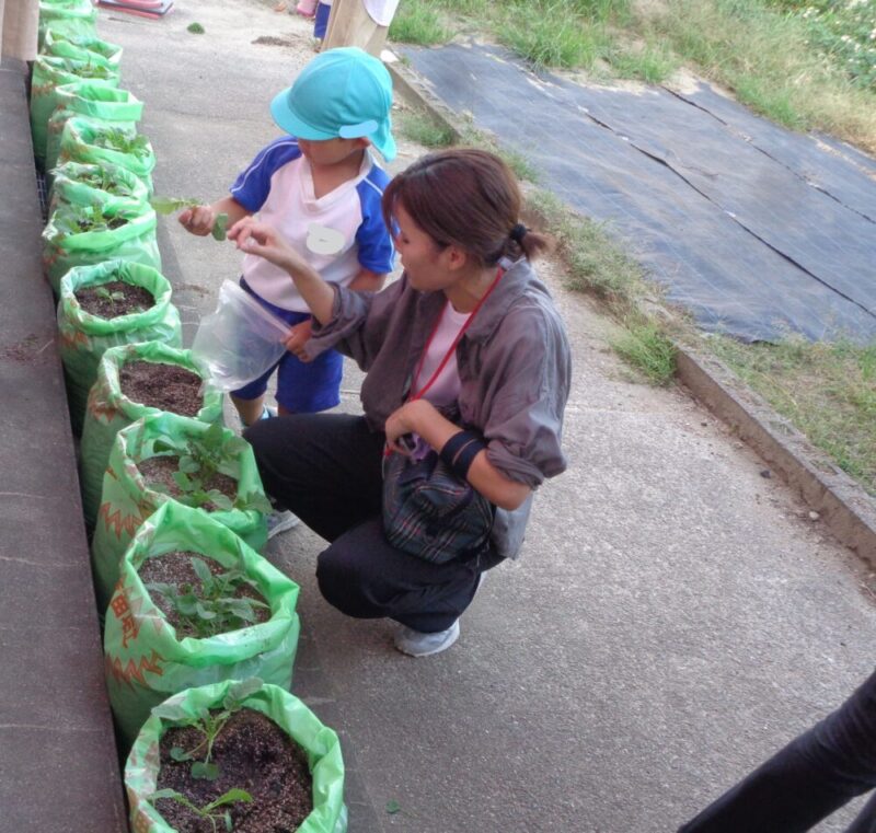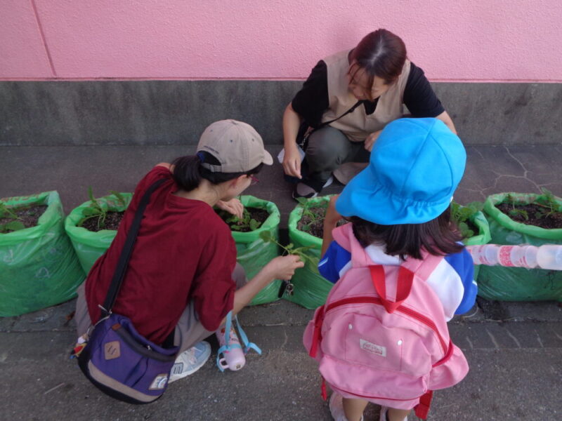 大根の芽がたくさん出てきました。子供たちも「くっついてきたな~」子供たちはよく見ています。このままだと根っこが狭くて大きく育てません。元気な芽を残しておく間引きをおうちの人と一緒にしました。「どの芽を残そうか?」「こっちの方は大きくなってるね」おうちの人と顔を見合わせながら、相談しています。「こっちにしようかな」そっと優しく抜いてあげていました。抜いた小さい大根を袋に入れながら「いい匂いする」「これ食べられるの?」と、おうちの人に聞いていました。「お味噌汁にいれてみようか」と、話している姿も・・・おうちの人と一緒に育てることで野菜を育てていく喜びや楽しみを感じていました。